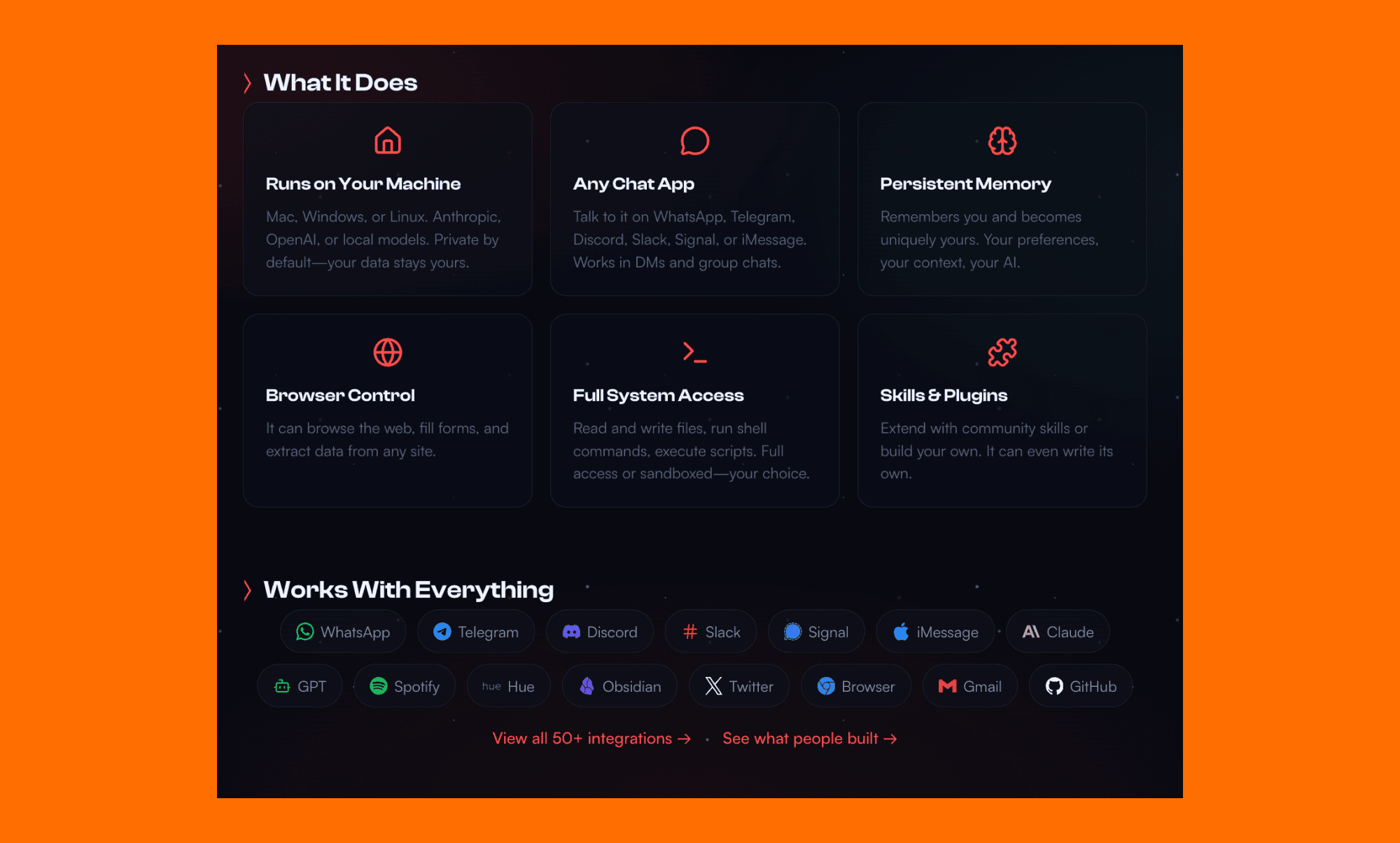 The showcase alone proves what's possible when you give an AI persistent memory and let it take real actions. People are building genuinely useful automations just by chatting.