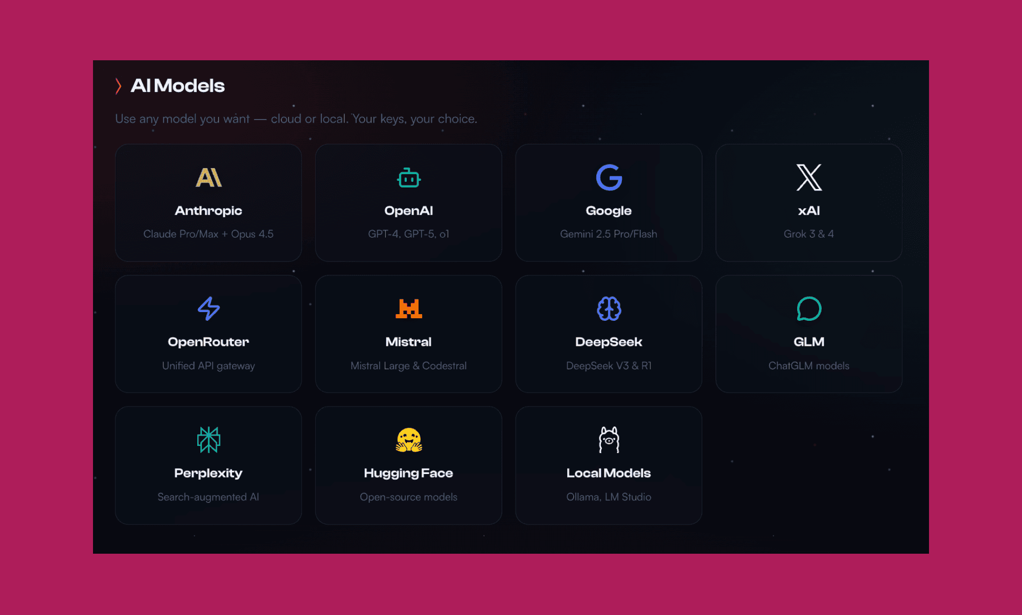 AI API: You bring your own. Anthropic Claude, OpenAI, or whatever provider you prefer. Or run local models to have it for free.