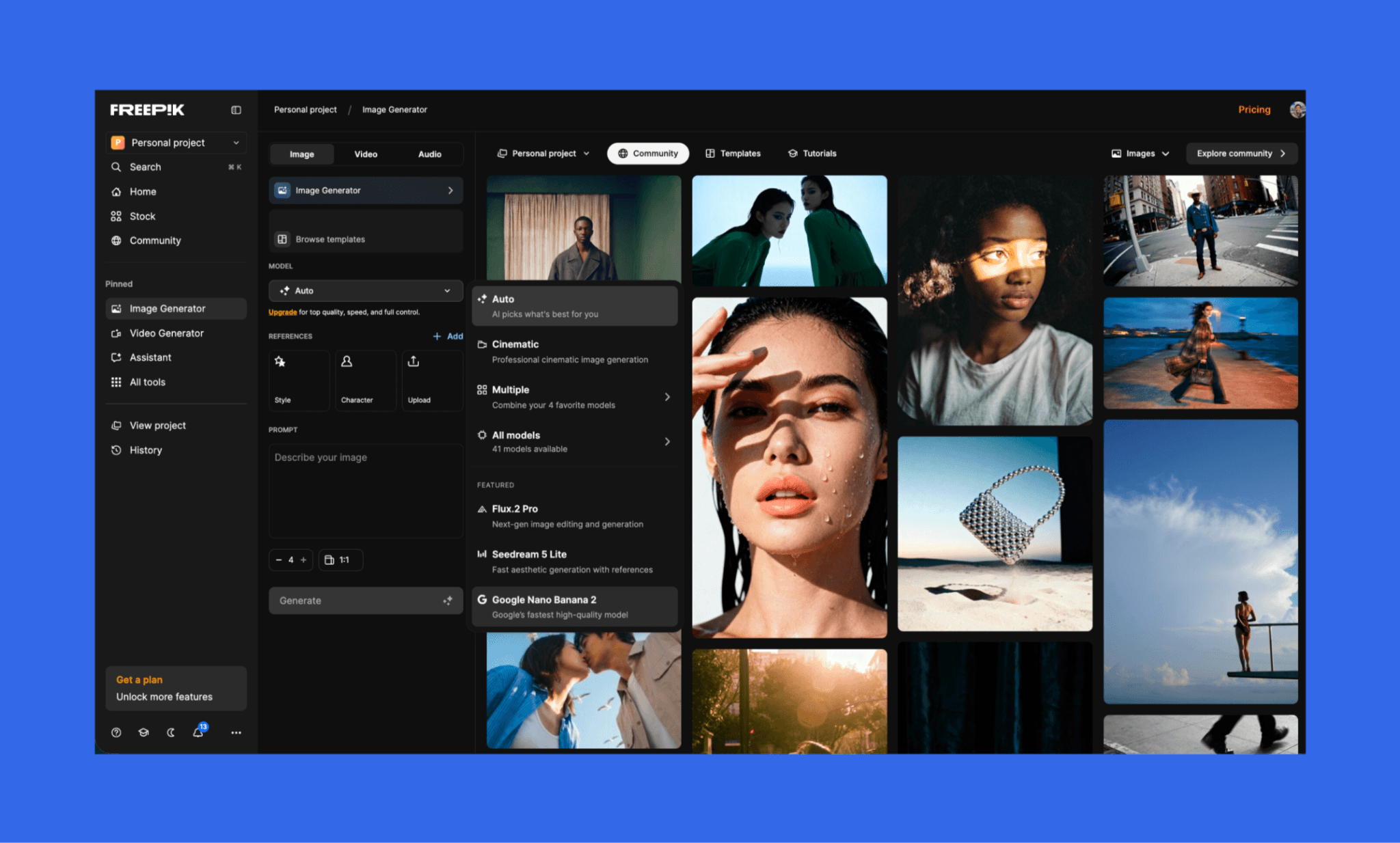 Once you open the Freepik Image Generator, there are plenty of settings to adjust to get the desired result. You can choose what to do with an image (upscale, remove background, etc.), pick a template (fashion shoot, tech product, documentary style, etc.), and choose from over 41 GenAI models, including Flux.2 Pro, Mystic 2.5 Fluid, and Nano banana.