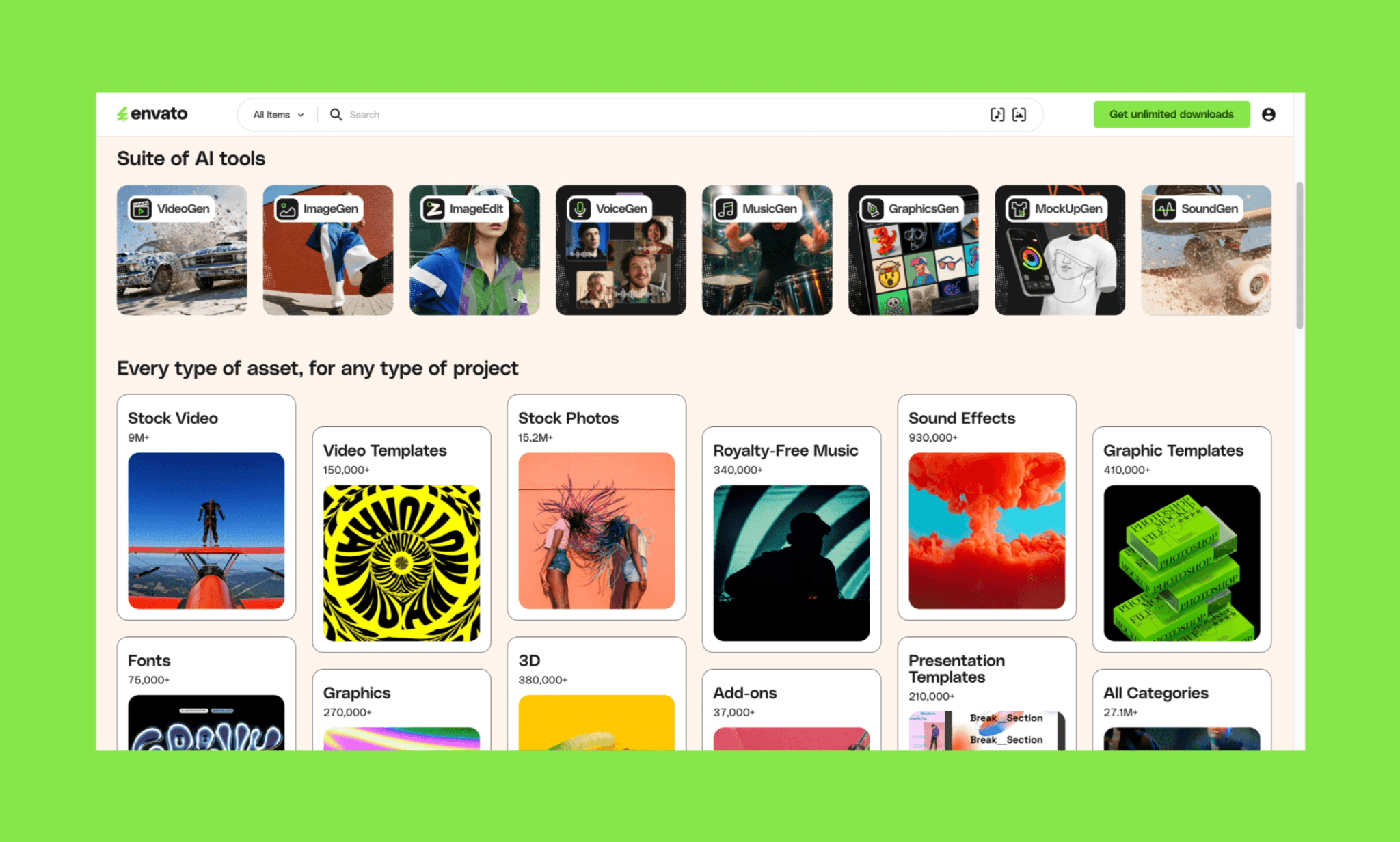 Envato is traditionally a stock asset platform with templates, graphics, and mockups, but it has started integrating AI features into its ecosystem. Compared to Freepik, Envato leans more toward ready-made design assets rather than AI-generated content.