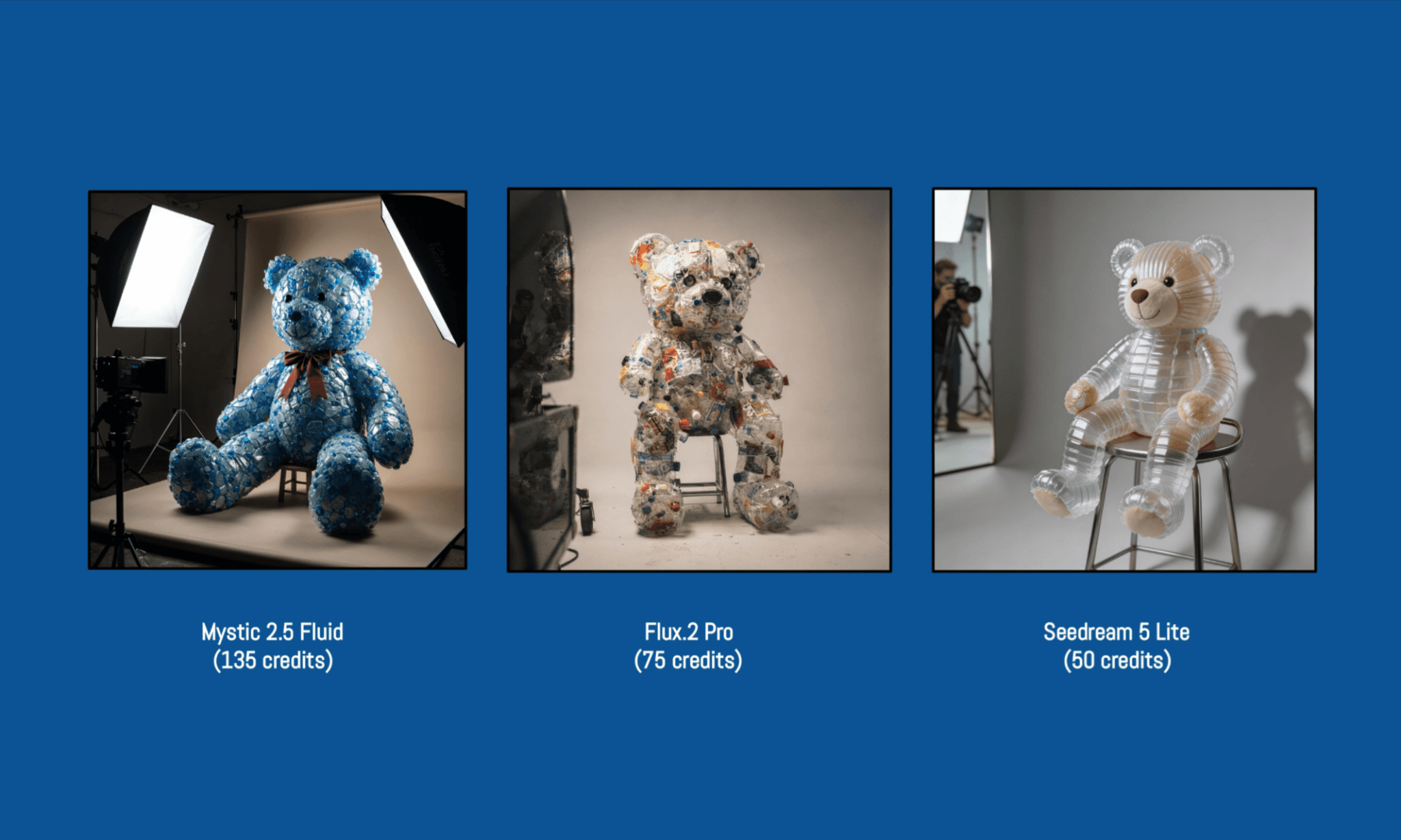 “A life-sized teddy bear made entirely from recycled plastic waste (bottles, wrappers, caps), posed in a high-fashion studio photoshoot, seated on a stool. Highly detailed textures showing different plastic materials.