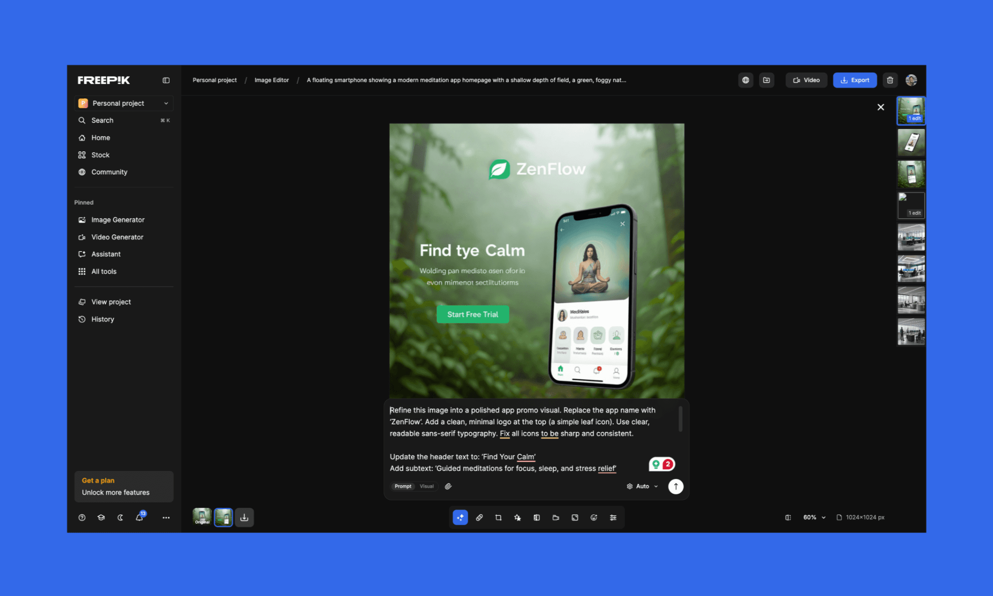 “Refine this image into a polished app promo visual. Replace the app name with ‘ZenFlow’. Add a clean, minimal logo at the top (a simple leaf icon). Use clear, readable sans-serif typography. Fix all icons to be sharp and consistent.
