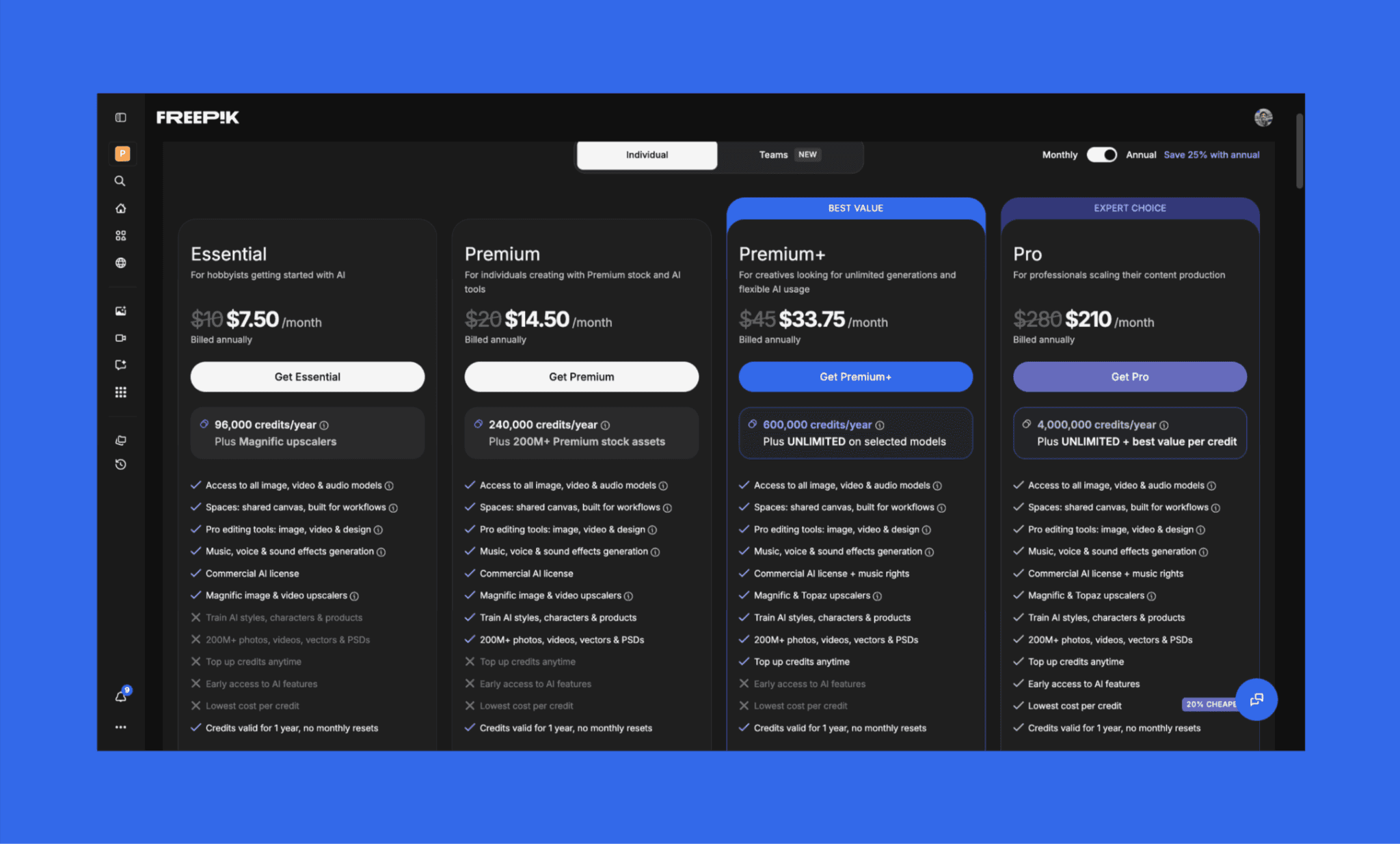*Note: This is the Freepik pricing as per yearly billing. The monthly billing is ~25% costlier for each plan.