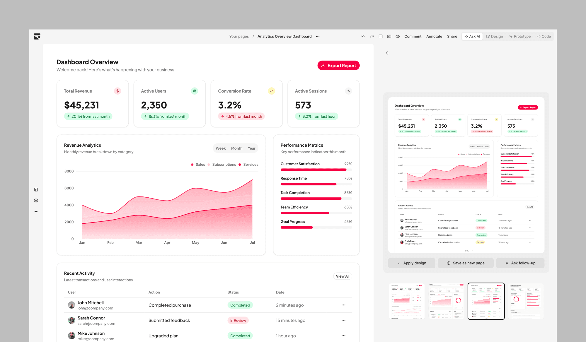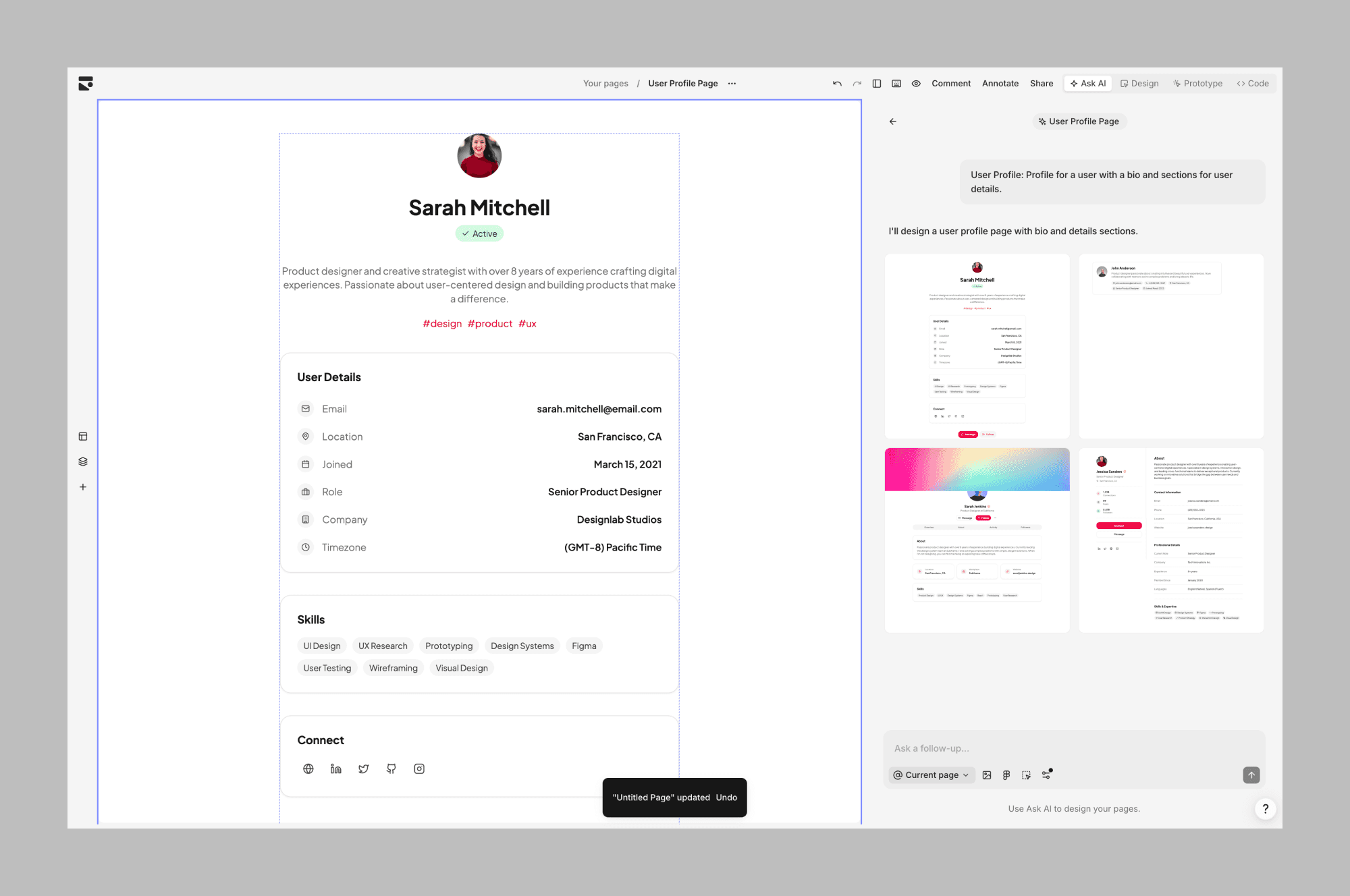 Replit's Design Mode lets you generate interactive mockups from a prompt. Unlike other tools in this list, it's primarily a vibe-coding tool, so it doesn't offer advanced features to organize different pages and design concepts. But nonetheless it's a solid alternative if you want a chat companion that can quickly visualize single concepts.