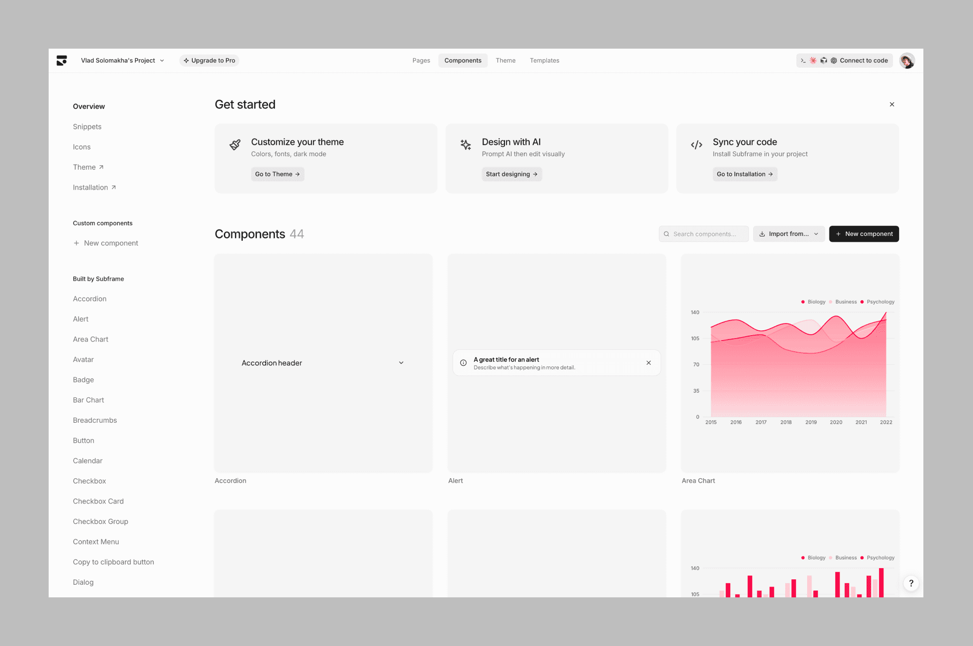 You can use the Subframe CLI to sync designs and components you generated directly into your project. The result is clean, human-readable React and Tailwind code that you fully own.