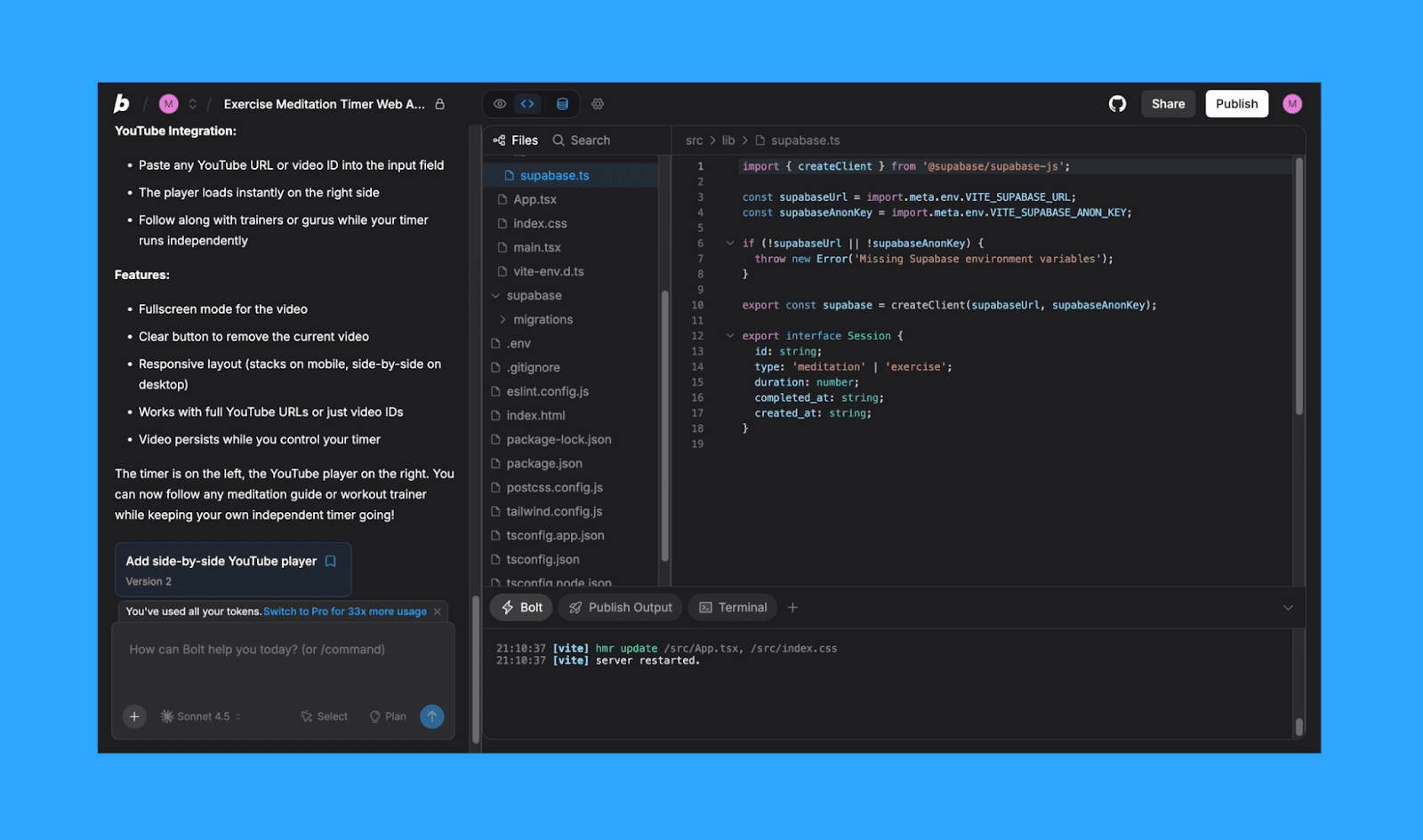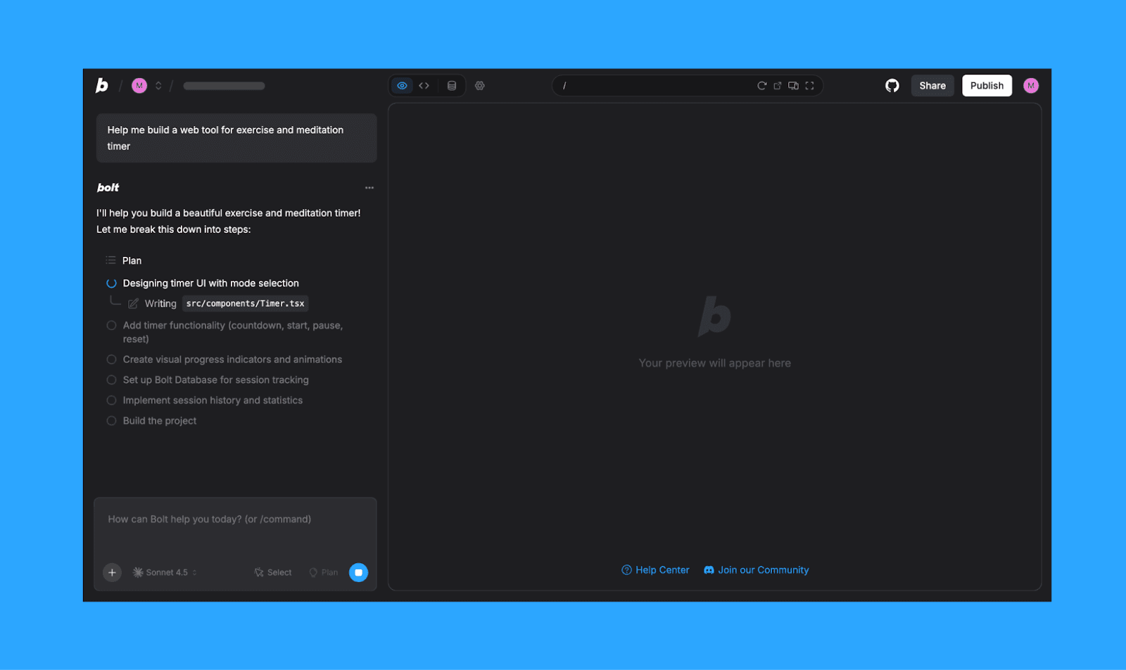 Bolt.new handles long, detailed prompts with its AI Enhancer to convert rough ideas into structured technical specifications. It accepts inputs as text, images, Figma files, and GitHub repositories, then scaffolds a full-stack web app in real time.
