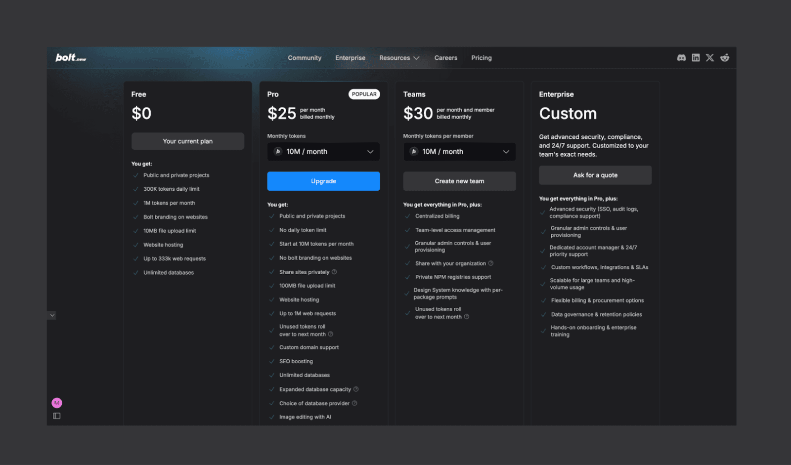 Since the token/credit count of the two is not directly comparable, the cheaper one between Bolt and Lovable depends on your use case. Still, if we take a $25 account, Lovable seems to offer more value because in its Pro plan, unlike Bolt, it offers unlimited users.