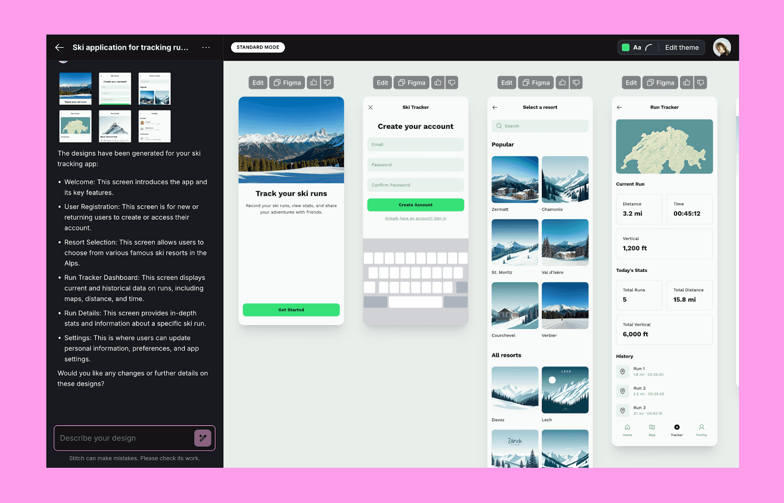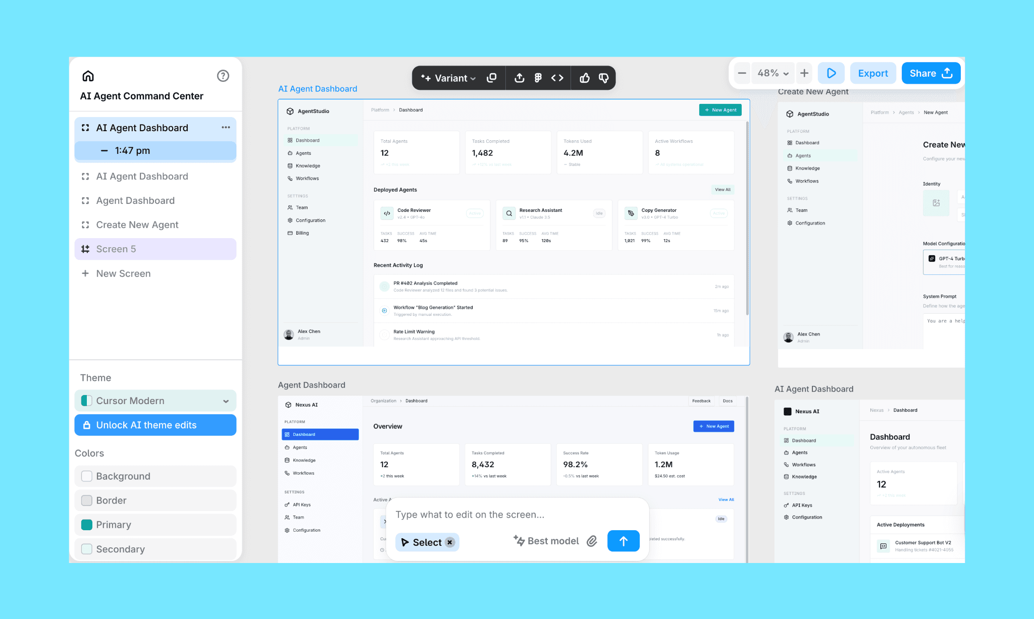 • Let’s you export to Figma, Google’s Jules, or copy code to the clipboard