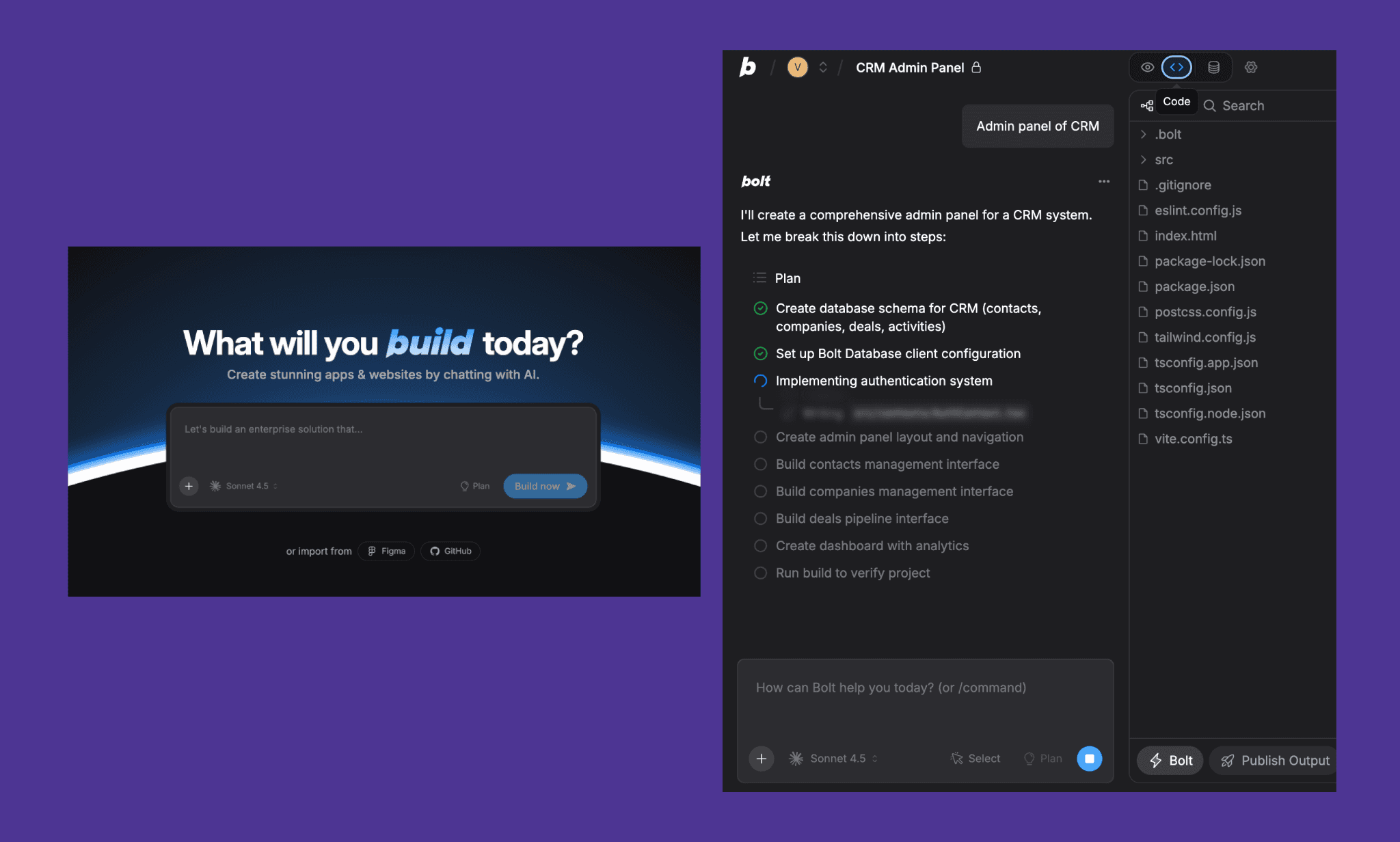 Bolt.new allows you to build entire apps in your browser. Front-end and backend deployment are also included. It’s great for quick prototyping and demos, where functionality is more important than design.