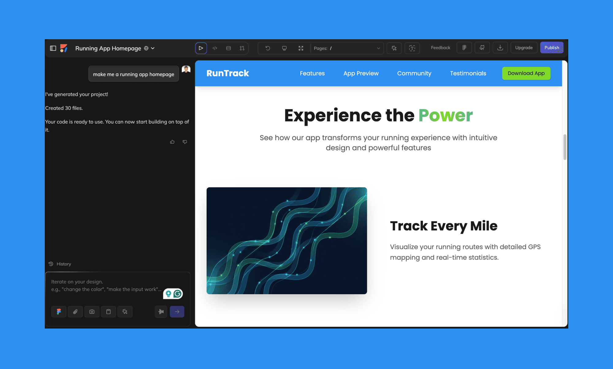 Lovable is straightforward: chat, templates, quick output. It’s good when the goal is speed and simplicity.