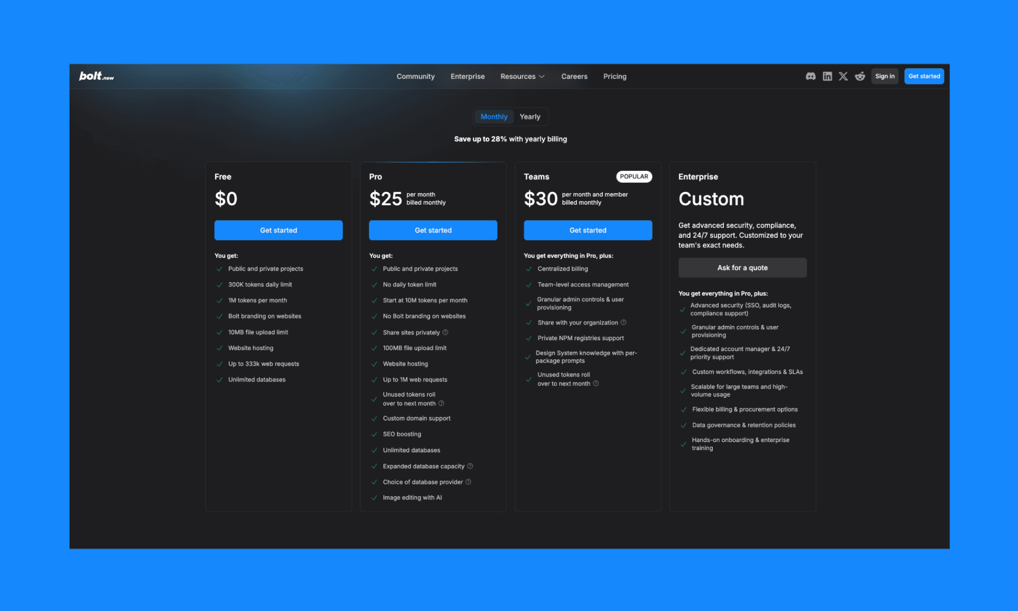 $0/mes • 1M tokens/mes • límite diario de 300K | Pro: $25/mes • 10M tokens/mes • dominio personalizado, sin marca | Desarrolladores que quieren generación de código full-stack en el navegador | |