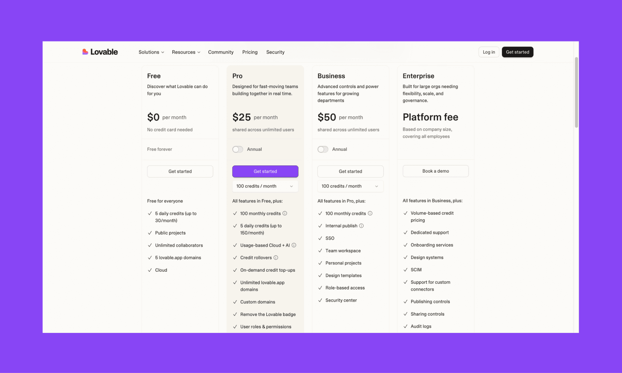 $0/mes • 25 créditos de mensajes/mes (límite diario de 5) • 500 créditos de integración | Starter: $20/mes • 100 créditos de mensajes • 2,000 créditos de integración | Fundadores no técnicos que crean SaaS full-stack, MVPs y herramientas internas con auth, DB y hosting integrados | |