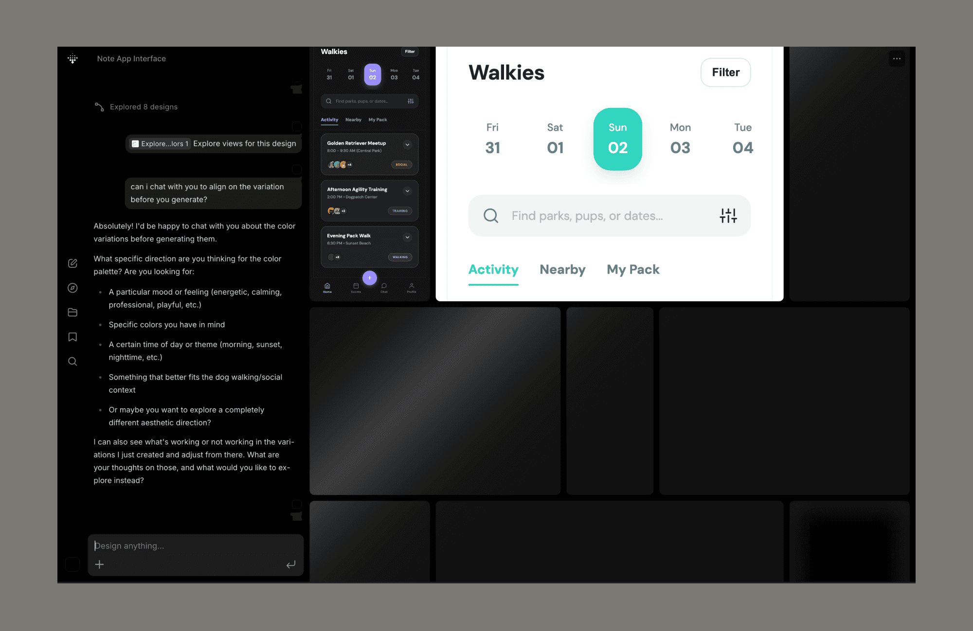 Você pode pedir para embaralhar layouts e paletas de cores. Ou explorar outros estados de design (como telas adicionais no fluxo de usuário, etc).