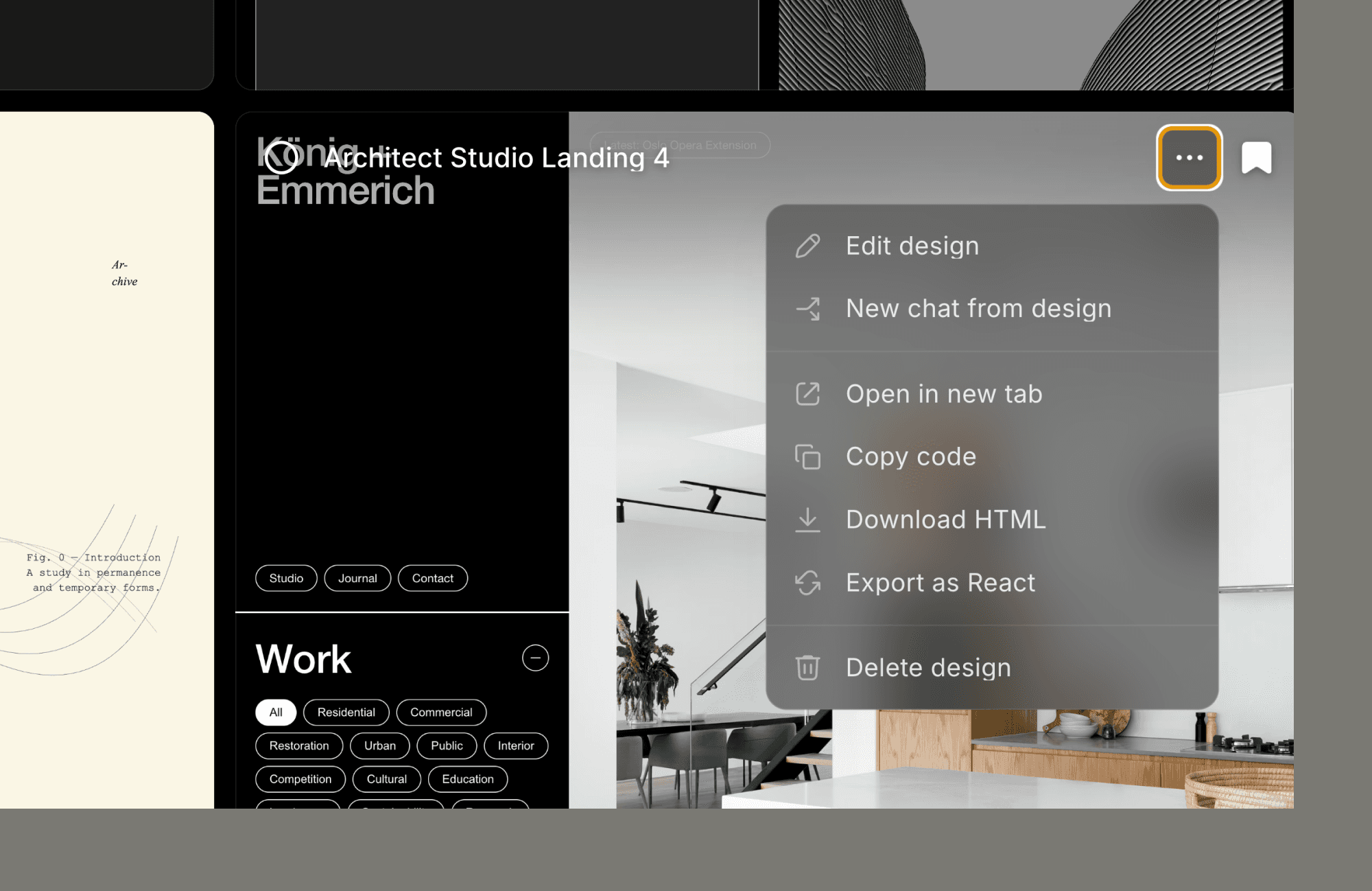 Todos os designs que você gera podem ser exportados instantaneamente como HTML. Você também pode solicitar que o Variant os exporte como código React.
