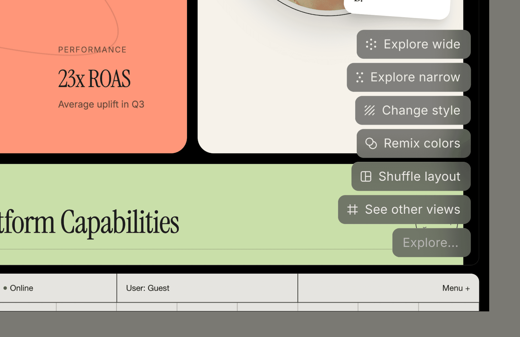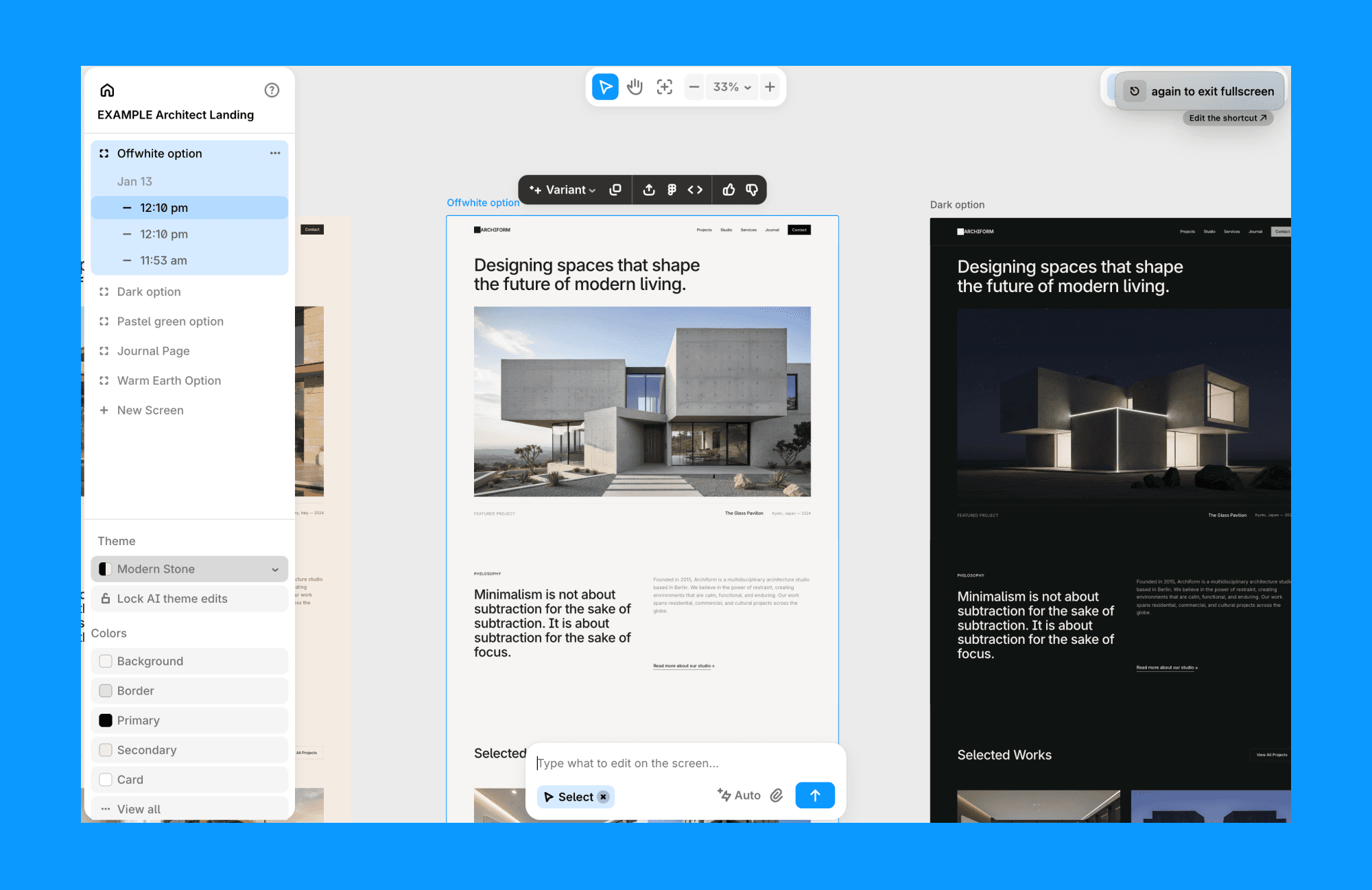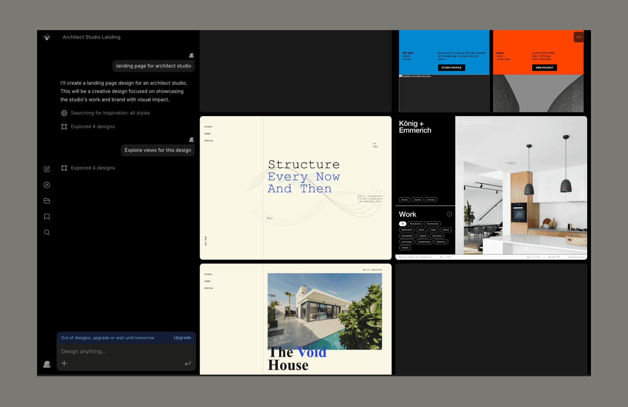 É uma ótima alternativa para exploração de design, e possui uma funcionalidade semelhante de múltiplas variantes a partir de um único prompt ao iniciar o projeto, além de atalhos para gerar diferentes variações de design sem prompts.